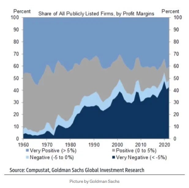 According to report recently published by Goldman Sachs, nearly half of all publicly traded firms are not profitable or worse
