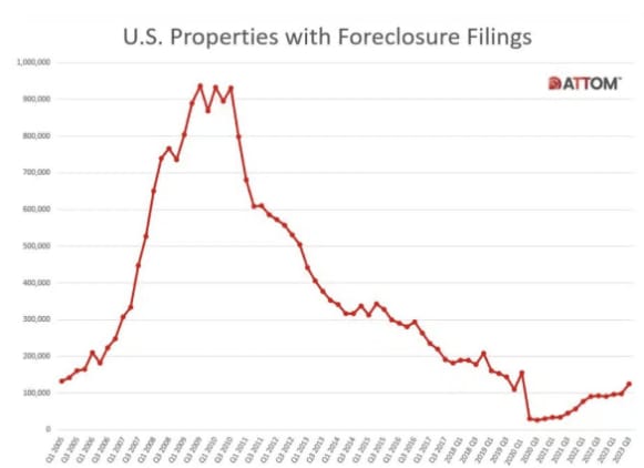 Any time you see a trendline move in a negative direction, it is worth taking note. However, it is also very important to consider context. Foreclosure filings were at an all-time low. Percentage increases are larger when coming off nominally lower rates. Foreclosure filings are still at pre-pandemic levels.