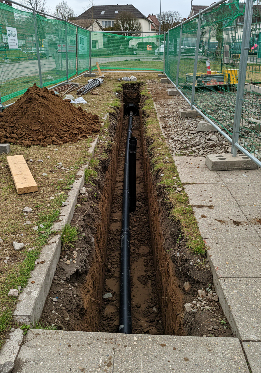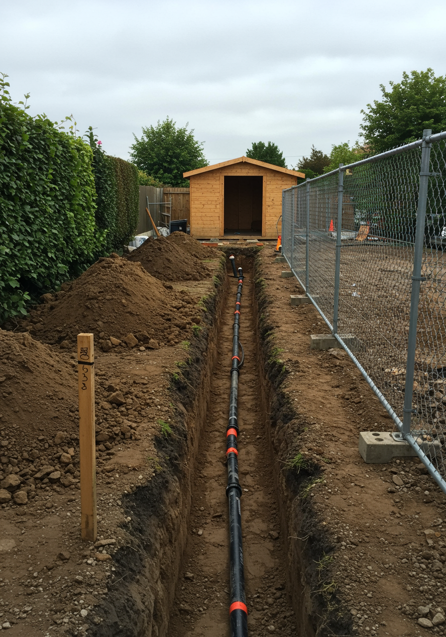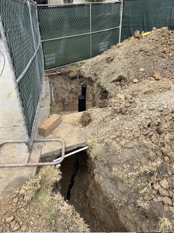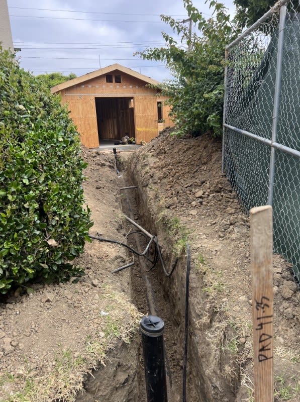 While we were waiting to sort out the Title 24 issues and get the heaters installed, we were able to make progress on our underground utilities. Below are some photos of the trench we had to dig to tie the sewer line for our new units into the existing sewer line.